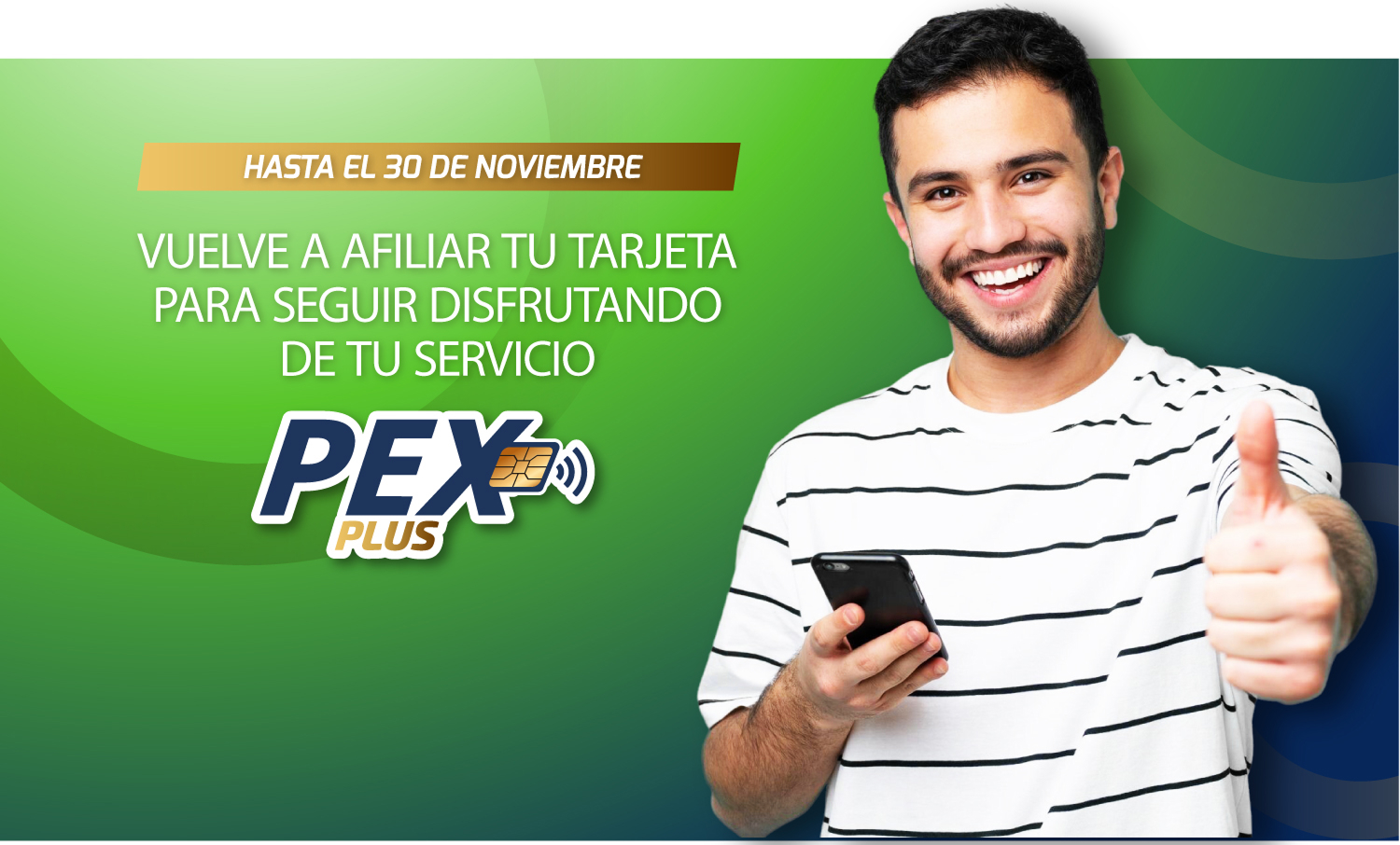 🚨 Hasta el 30 de noviembre, todos los usuarios de PEX Plus deben volver a afiliar su tarjeta a través de la App para continuar usando el servicio sin interrupciones.